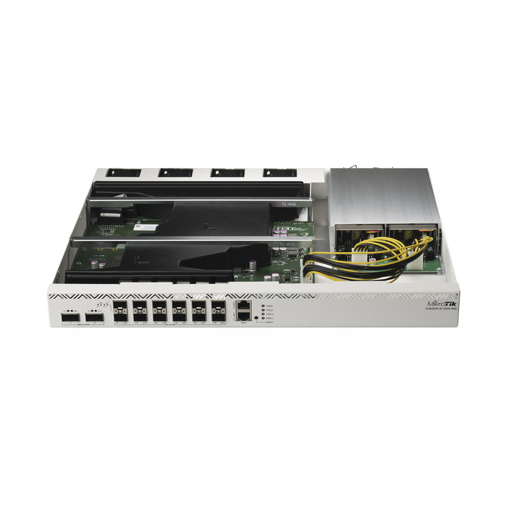 Hay 2 jaulas QSFP28 para una conectividad ultrarrápida de 100 Gigabit, 12 jaulas SFP28 para redes de 25 Gigabit y un puerto Gigabit Ethernet. El dispositivo viene con 16 GB de RAM, almacenamiento NAND decente y dos ranuras SATA M.2 para almacenamiento adicional. Hay cuatro ventiladores intercambiables en caliente, así como fuentes de alimentación intercambiables en caliente de doble redundancia. Y estas fuentes de alimentación podrían parecer familiares si ha usado nuestro CCR1072 antes: puede seguir usando sus fuentes de alimentación intercambiables en caliente anteriores y módulos SFP.