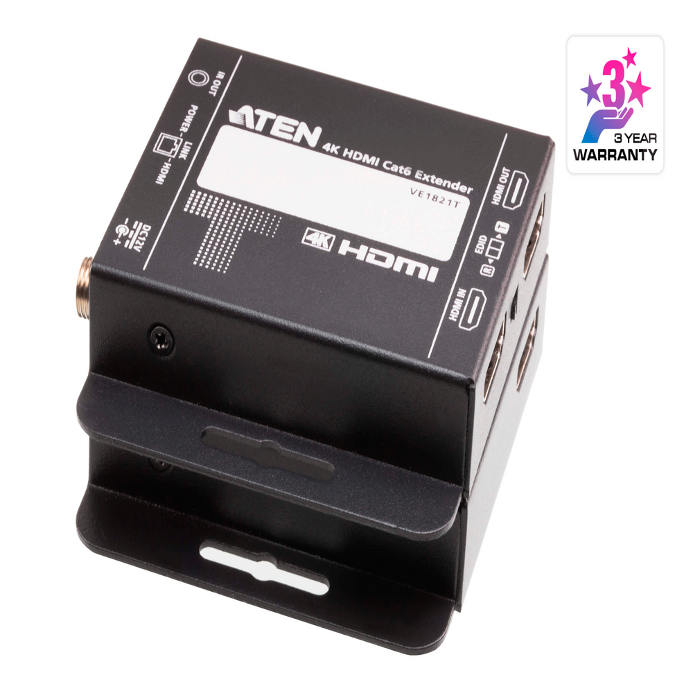 Solución ideal para conectar equipos en ubicaciones remotas de hasta 100 m a través de un solo cable Cat 5e/6/6a. Con el modo de largo alcance habilitado, el VE1812 puede extender la señal HDMI hasta 150 m a 1080p. Admite paso de señalización RS-232 e IR, lo que permite a los usuarios controlar el dispositivo fuente HDMI desde la unidad receptora (VE1812R) y al mismo tiempo acceder al dispositivo de visualización HDMI desde la unidad transmisora ​​(VE1812T). Las señales IR también se pueden extender en ambas direcciones. Cuenta con alimentación a través de HDBaseT (PoH) que envía energía de Tx a Rx a través de un cable Cat 5e/6/6a sin ninguna fuente de alimentación adicional. El VE1812 es compatible con HDMI (3D, Deep Color, 4K) y HDCP. Al transmitir HDMI/4K con un cable Cat 6a o ATEN 2L-2910 Cat 6, la distancia máxima puede alcanzar hasta 100 metros.