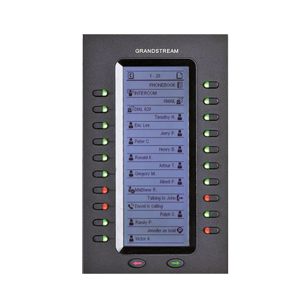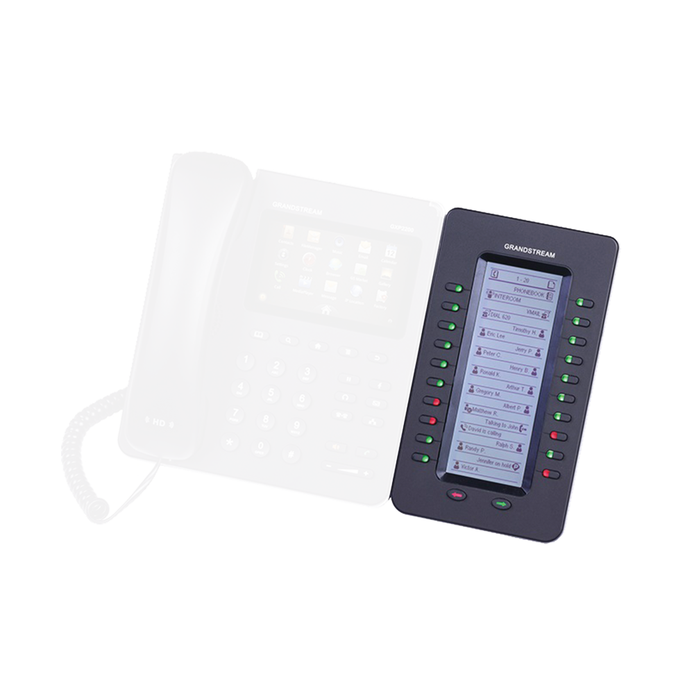 El módulo de extensión GXP2200EXT es soportado por el GXP2140, GXP2170, GXV3240 y GXP2200. El módulo incluye 20 teclas de extensión de dos colores y dos teclas de flecha para cambiar de página, permitiendo a cada GXP2200EXT contar con hasta 40 extensiones. Tiene una gran pantalla LCD retroiluminada para fácil visualización. Se pueden conectar hasta 4 módulos GXP2200EXT para tener un total de 160 contactos/extensiones.